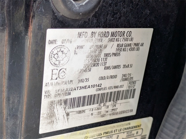 Equipped with GVWR: 7,520 lbs Payload Package, 12 Speakers, 20 Polished Aluminum Wheels, 3.31 Axle Ratio, 3rd row seats: split-bench, 4-Wheel Disc Brakes, ABS brakes, Adjustable pedals, Air Conditioning, Alloy wheels, AM/FM radio: SiriusXM, Auto-dimming door mirrors, Auto-dimming Rear-View mirror, Automatic temperature control, Brake assist, Bumpers: body-color, CD player, Compass, Delay-off headlights, Driver door bin, Driver vanity mirror, Dual front impact airbags, Dual front side impact airbags, Electronic Stability Control, Emergency communication system: 911 Assist, Exterior Parking Camera Rear, Four wheel independent suspension, Front anti-roll bar, Front Bucket Seats, Front Center Armrest, Front dual zone A/C, Front fog lights, Front reading lights, Fully automatic headlights, Garage door transmitter, Heated & Cooled Perforated Leather Fr Bucket Seats, Heated door mirrors, Heated front seats, Heated rear seats, Illuminated entry, Leather Shift Knob, Leather steering wheel, Low tire pressure warning, Memory seat, Occupant sensing airbag, Outside temperature display, Overhead airbag, Overhead console, Panic alarm, Passenger door bin, Passenger vanity mirror, Pedal memory, Power door mirrors, Power driver seat, Power Liftgate, Power passenger seat, Power steering, Power windows, Radio data system, Radio: Premium Sony Sound System w/Single-Disc/MP3, Rain sensing wipers, Rear air conditioning, Rear anti-roll bar, Rear audio controls, Rear reading lights, Rear window defroster, Rear window wiper, Remote keyless entry, Roof rack, Security system, SiriusXM Satellite Radio, Speed control, Speed-sensing steering, Speed-Sensitive Wipers, Split folding rear seat, Steering wheel mounted audio controls, SYNC 3 Communications & Entertainment System, Tachometer, Telescoping steering wheel, Tilt steering wheel, Traction control, Trip computer, Turn signal indicator mirrors, Variably intermittent wipers, Ventilated front seats, and Voltmeter Visit Us at www.CARite.com then CARite of Cocoa to view more pictures. Call Us Today At 321-877-1000 To Schedule Your V.I.P Appointment!