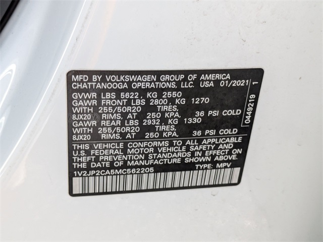 Equipped with 3.60 Axle Ratio, 3rd row seats: split-bench, 4-Wheel Disc Brakes, 6 Speakers, ABS brakes, Air Conditioning, Alloy wheels, Auto-dimming Rear-View mirror, Automatic temperature control, Brake assist, Bumpers: body-color, Compass, Delay-off headlights, Driver door bin, Driver vanity mirror, Dual front impact airbags, Dual front side impact airbags, Electronic Stability Control, Emergency communication system: VW Car-Net services (capabilities require enrollment or subscription), Exterior Parking Camera Rear, Forward collision: FCW w/Autonomous Emergency Braking mitigation, Four wheel independent suspension, Front anti-roll bar, Front Bucket Seats, Front Center Armrest, Front dual zone A/C, Front fog lights, Front reading lights, Fully automatic headlights, Heated Comfort Front Bucket Seats, Heated door mirrors, Heated front seats, Illuminated entry, Leather Shift Knob, Low tire pressure warning, Occupant sensing airbag, Outside temperature display, Overhead airbag, Overhead console, Panic alarm, Passenger door bin, Passenger vanity mirror, Perforated V-Tex Leatherette Seating Surfaces, Power door mirrors, Power driver seat, Power Liftgate, Power steering, Power windows, Radio data system, Rain sensing wipers, Rear air conditioning, Rear anti-roll bar, Rear reading lights, Rear seat center armrest, Rear window defroster, Rear window wiper, Remote keyless entry, Roof rack: rails only, Security system, Speed control, Speed-sensing steering, Split folding rear seat, Spoiler, Standard Suspension, Steering wheel mounted audio controls, Tachometer, Telescoping steering wheel, Tilt steering wheel, Traction control, Trip computer, Turn signal indicator mirrors, Variably intermittent wipers, and Wheels: 20 5-Spoke Silver Alloy Visit Us at www.CARite.com then CARite of Cocoa to view more pictures. Call Us Today At 321-877-1000 To Schedule Your V.I.P Appointment!